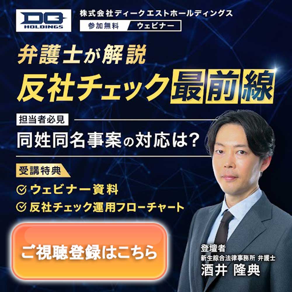 | タイトル | 無料オンデマンドウェビナー 【弁護士が解説】 反社チェック最前線 <担当者必見>同姓同名事案の対応は? |