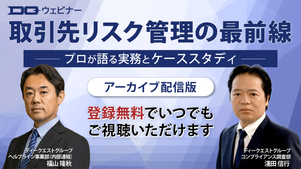 本ウェビナーでは、コンプライアンス調査と取引先窓口設置・運用のサービスをご提供する弊社が取引開始から継続、そして課題解決まで、取引先との関係における各段階で「実際に何が起こるのか」「どう対応すべきか」を実務経験に基づく具体的事例とともに対談形式でお伝えします。