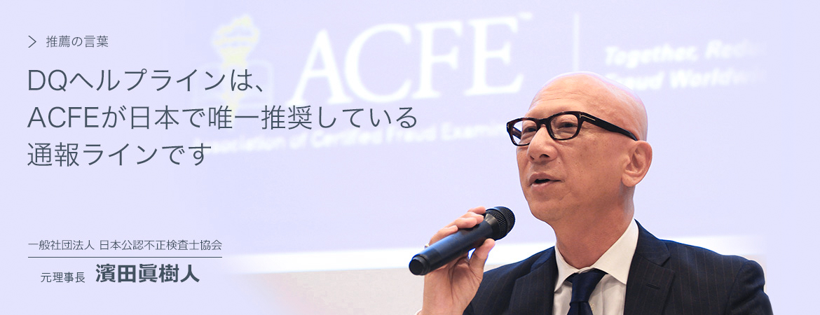 一般社団法人日本公認不正検査士協会(ACFE JAPAN)は、その ACFE が日本で唯一推奨している通報窓口であるDQヘルプラインを推薦します。