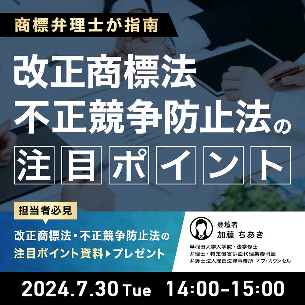 | タイトル | 無料ウェビナー 【商標弁理士が指南】 改正商標法・不正競争防止法の注目ポイント |